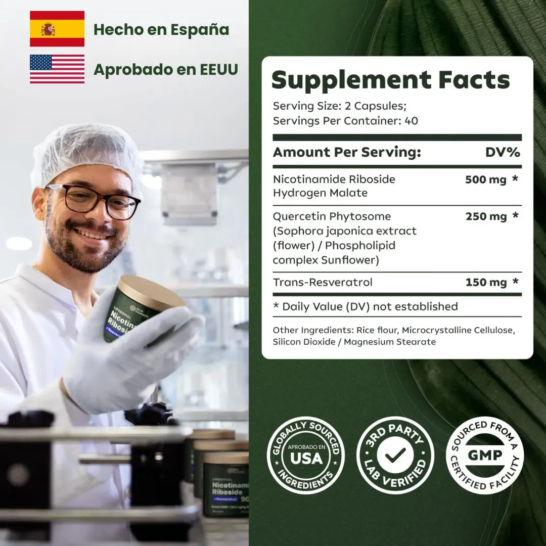 Energía duradera:El Ribósido de Nicotinamida y Coenzima Q10 optimizan la producción de energía celular, manteniéndote activo y vital todo el día.
